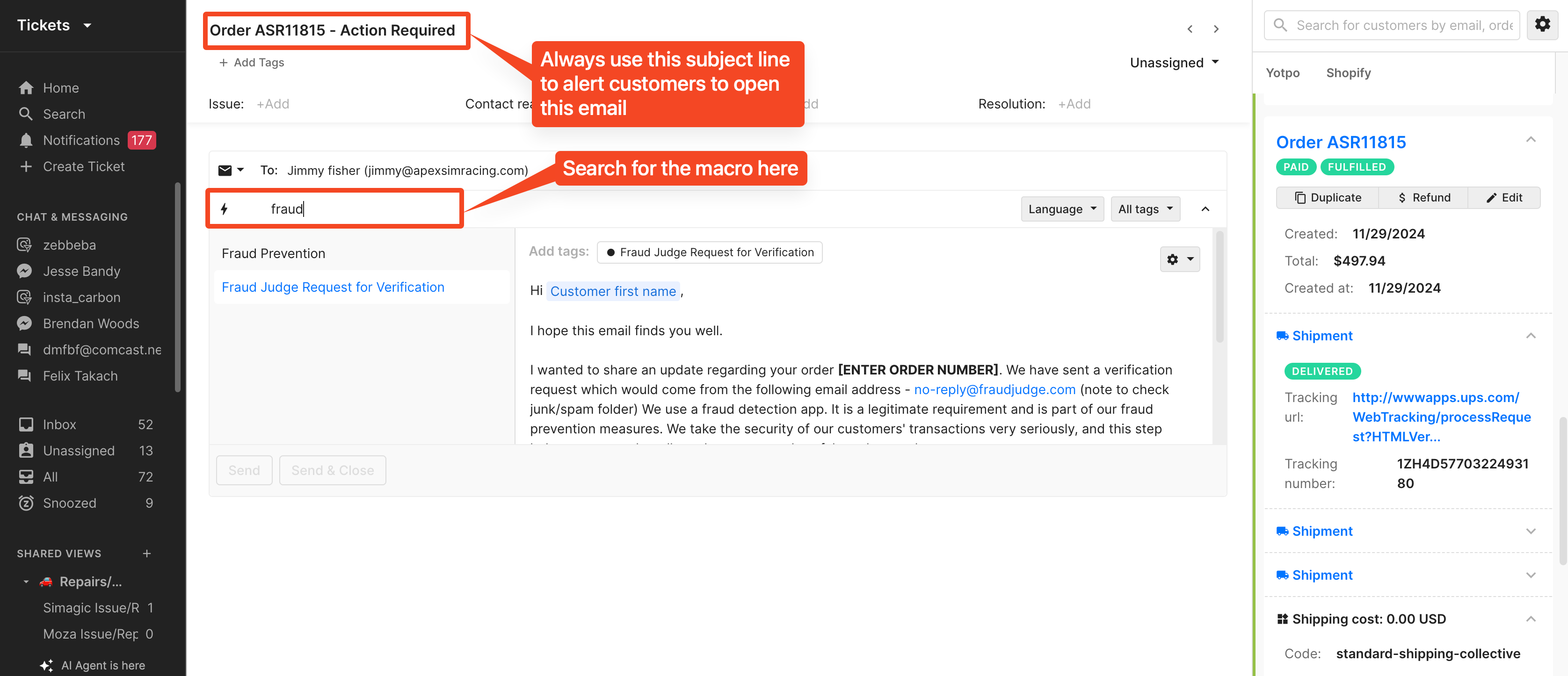 Then, head over to Gorgias and create a new ticket. Use the macro called "Fraud Judge Request for Verification". Be sure to use the correct subject line and ensure the correct order number is referenced. Using the Shopify quick access tab on the right can help locate the order you are requesting verification for. Image for reference: