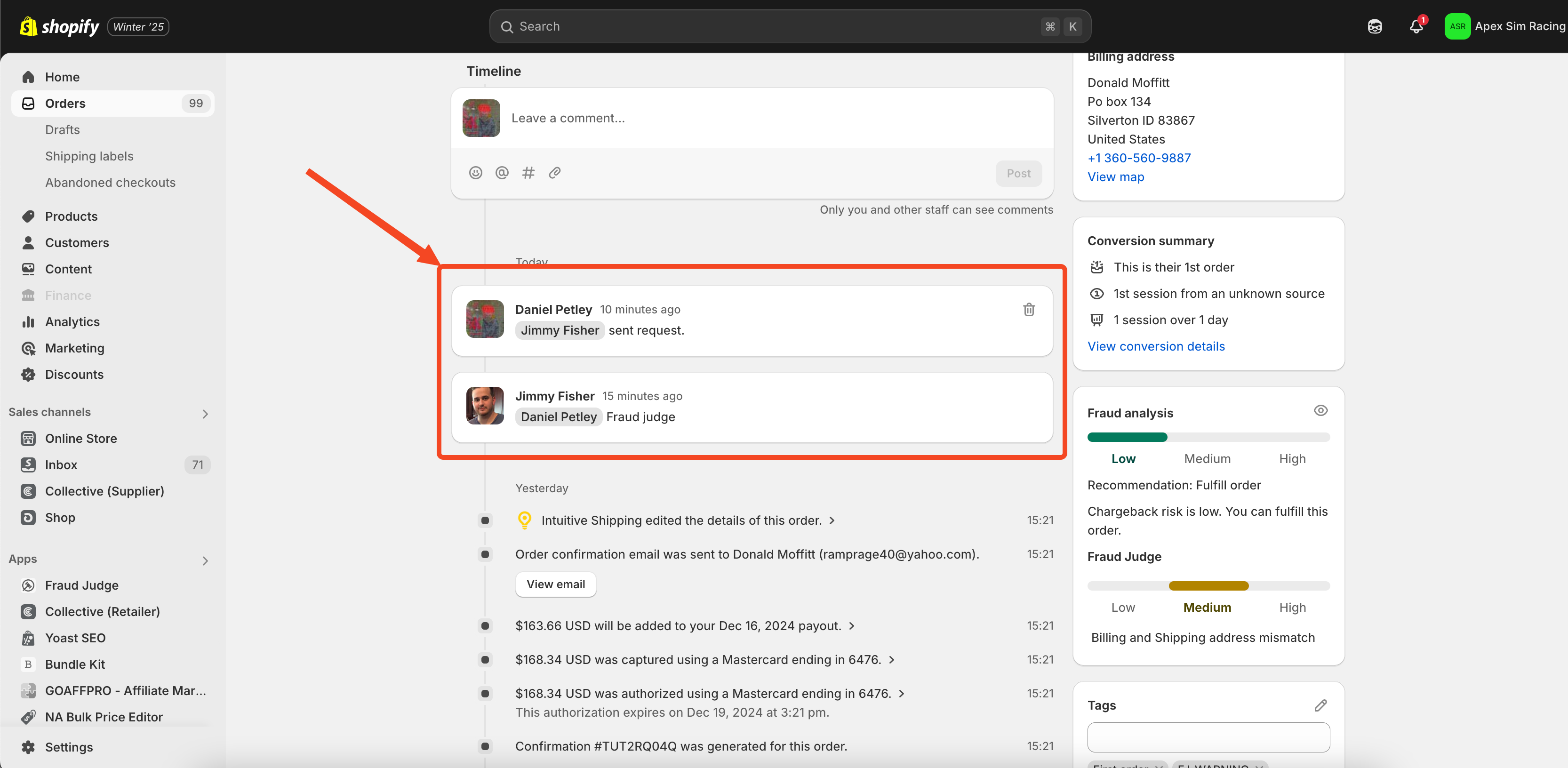First, set up a forwarding label in Gmail or your preferred email provider for orders where either, Jimmy, Chris or Daniel are tagging you. These comments fall under the order timeline.