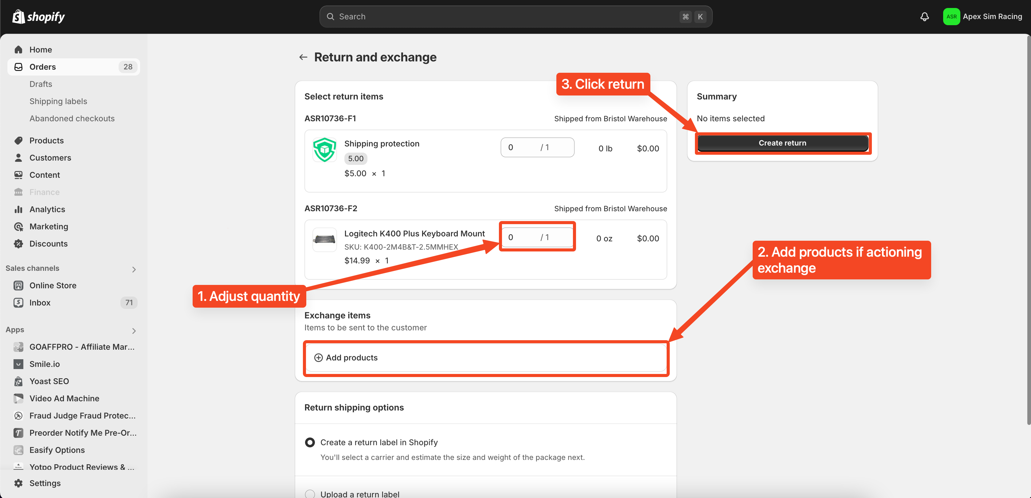 In the Exchange items section, click Add products (refer to screenshot in the previous step)
