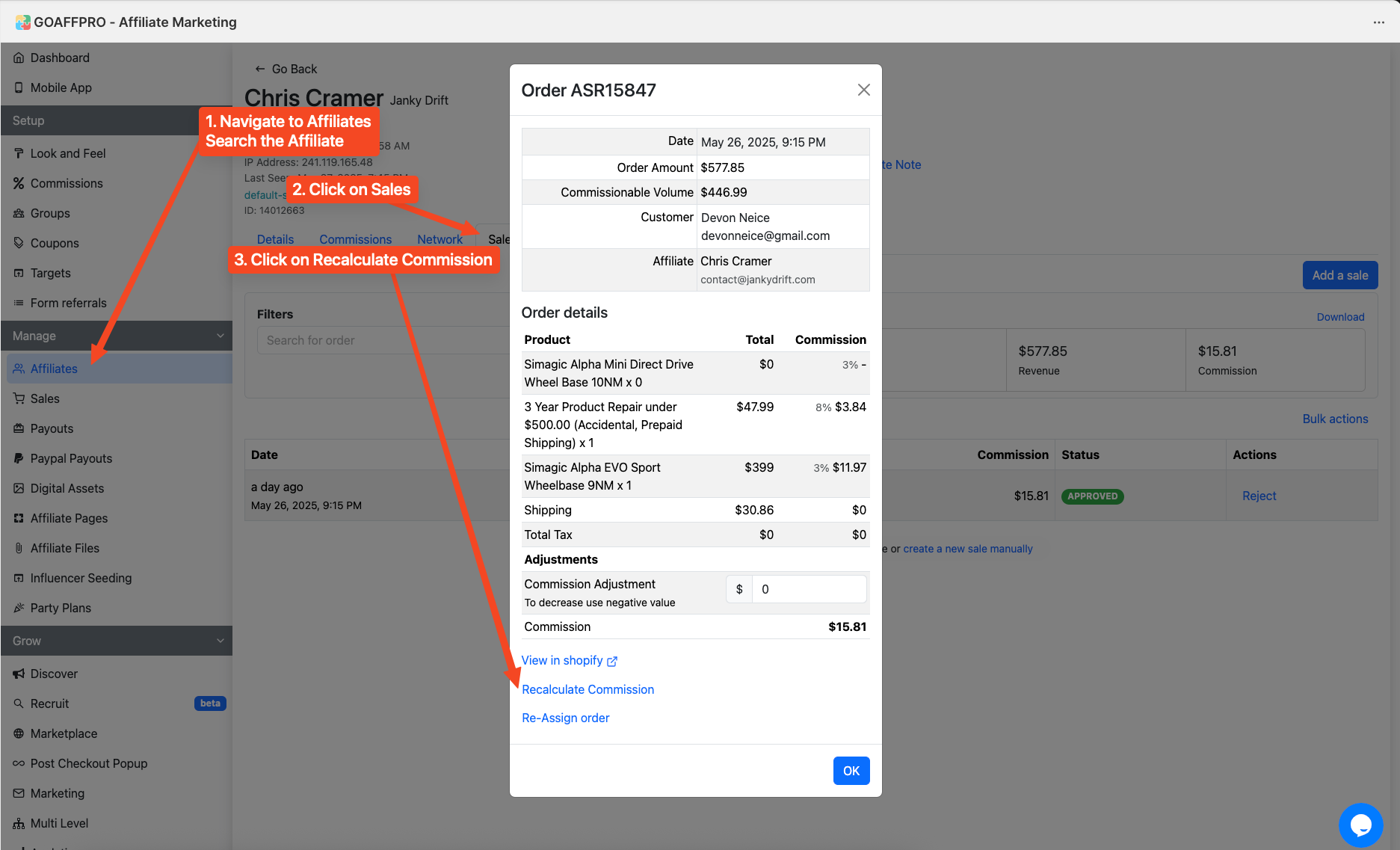 When exchanging a product, ALWAYS take note of the affiliate. If you adjust the order, GOAFF Pro needs to recalculate the commission as shown in the screenshot below:
