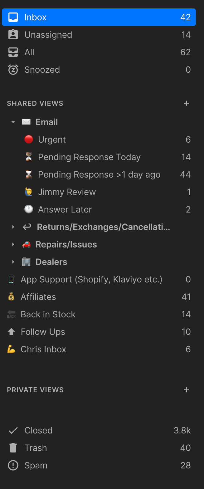- On the left-hand sidebar, you’ll find your Shared Views and Private Views sections. Views are organized into different categories like Email, Repairs/Issues, Affiliates, and more.
